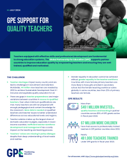 Focused investments: For effective teaching to happen, teachers must have the right knowledge and skills as well as professional development opportunities. GPE invests in pre- and in-service training, coaching and mentoring, teacher management, and teaching tools such as teachers’ guides. GPE uses a portion of its grants to encourage the delivery of policy reforms that address obstacles to effective teaching.